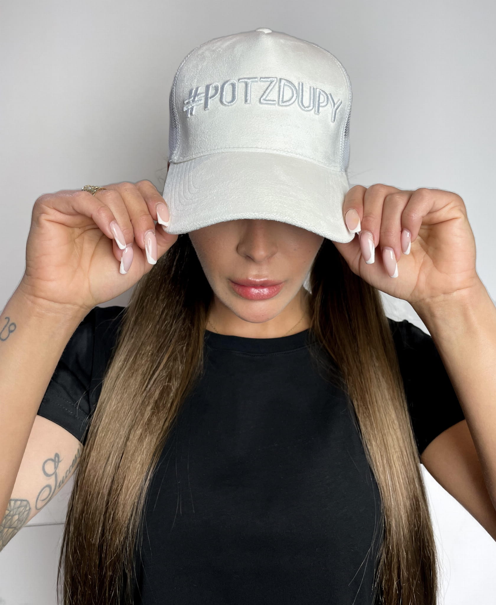 Biała czapeczka z daszkiem wykonana na przodzie z najlepszego gatunku aksamitnego zamszu , tył natomiast z lekkiej przewiewnej siateczki. Przód zdobi wyszywane hasło motywacyjne Ady #POTZDUPY