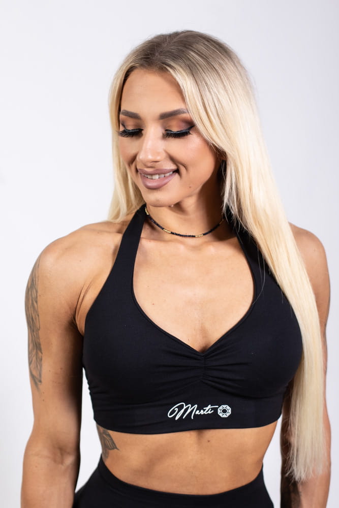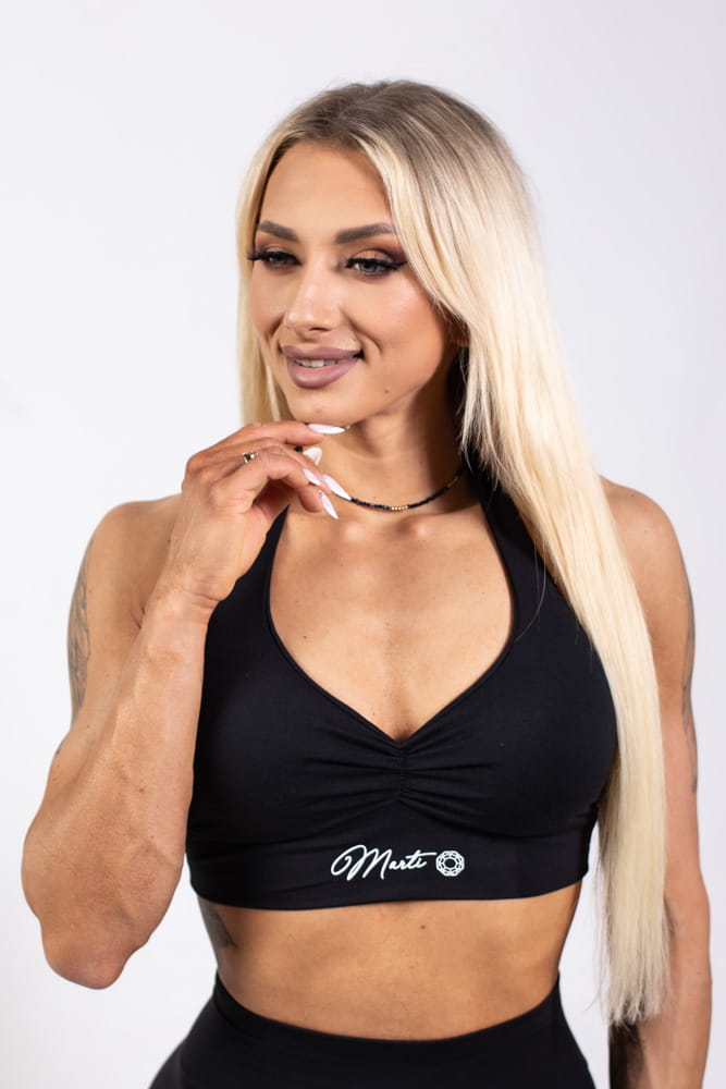 Top z regulowanymi ramiączkami na szyje oraz marszczonym przodem, który ładnie podkreśla kształt biustu. Wewnątrz umieszczone są wyciągane wkładki.